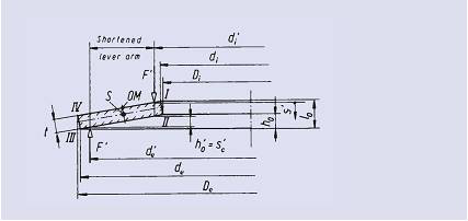 DIN2093標(biāo)準(zhǔn)詳細(xì)規(guī)定了盤片厚度由t減到t’的情況。A、B系列彈簧t’與t之間的平均厚度減薄比為0.938,C系列彈簧t’與t之間的平均厚度比為0.995。由于支撐面的存在,已不必對(duì)橫截面邊緣I…IV角點(diǎn)的載荷應(yīng)力進(jìn)行計(jì)算。因此計(jì)算應(yīng)力或多或少高于用更為精確的方法計(jì)算的角部實(shí)際應(yīng)力。由于這些數(shù)值只是一些名義值,因此偏差并不重要。